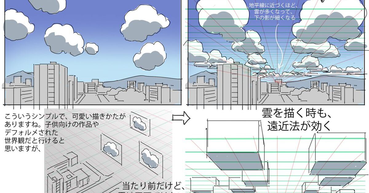 プロが教える 雲の描き方 がとても分かりやすいと好評 雲を描く時も遠近法が効く Togetter